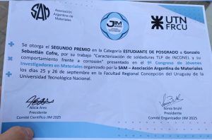 La Universidad Nacional del Comahue (UNCo), a través del Grupo de Ciencias y Tecnologías de Materiales del Instituto de Investigación y Desarrollo en Ciencia y Tecnología de Materiales (IITCI CONICET-UNCo), celebra con orgullo el logro académico del becario doctoral Ing. Gonzalo Cofre, quien obtuvo el Segundo Premio al Trabajo de Postgrado en el marco del 9º Congreso de Jóvenes Investigadores en Materiales (JIM 2025).