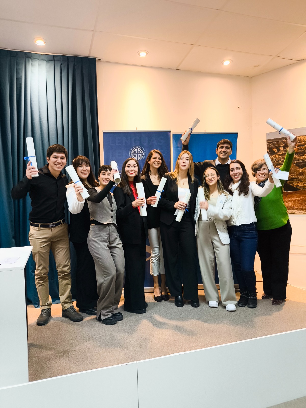 En simultáneo, se entregaron los diplomas a 10 egresados y egresadas de la Facultad de Lenguas, dos de ellos de posgrado. El Acto fue presidido por la Vicedecana, Andrea Saade, la Secretaria Académica,Paola Formiga, la Secretaria de Extensión, Romina Carabajal, y, e el Secretario de Planeamiento y Desarrollo Institucional UNCo, Christian Lopes.