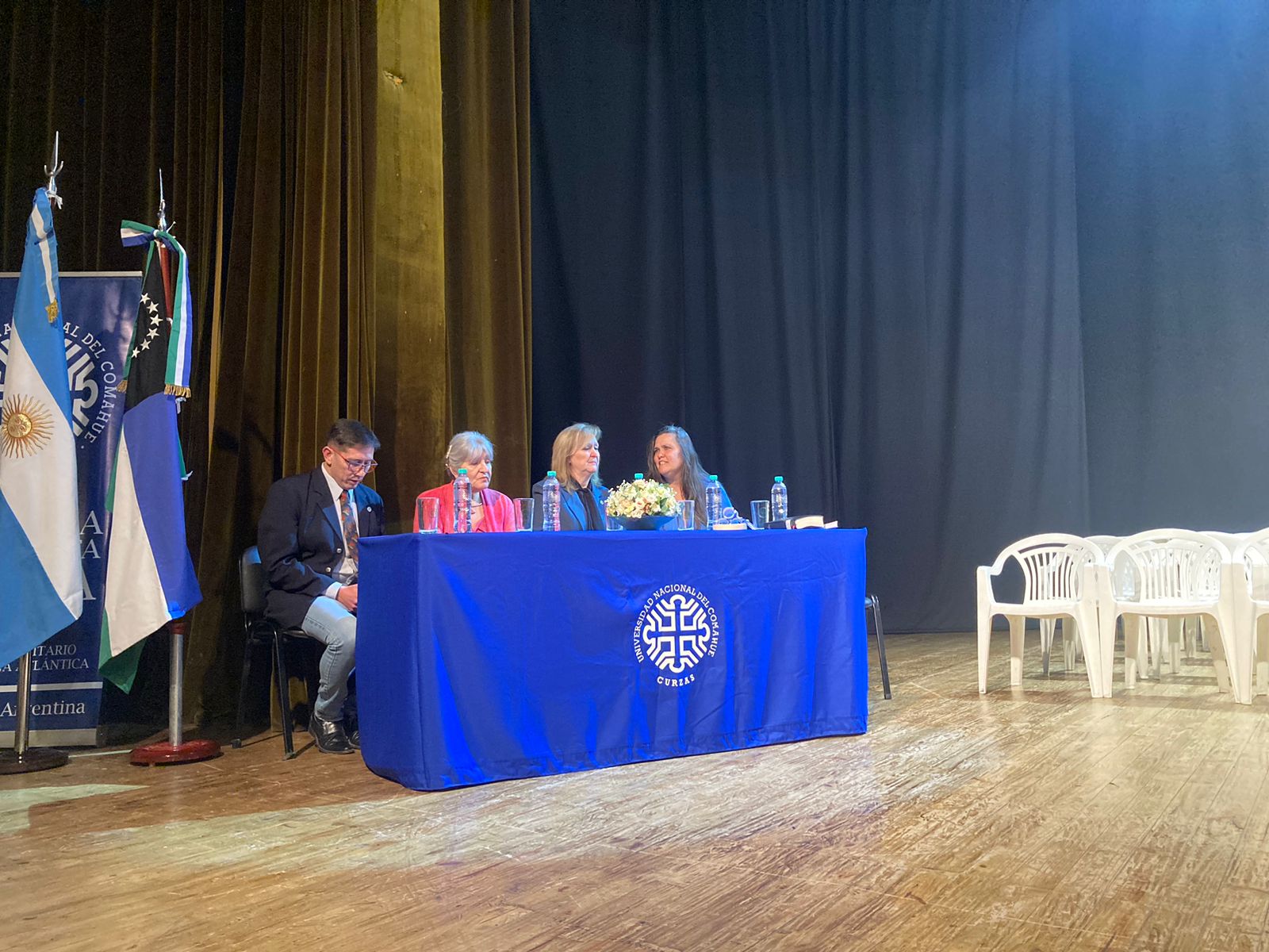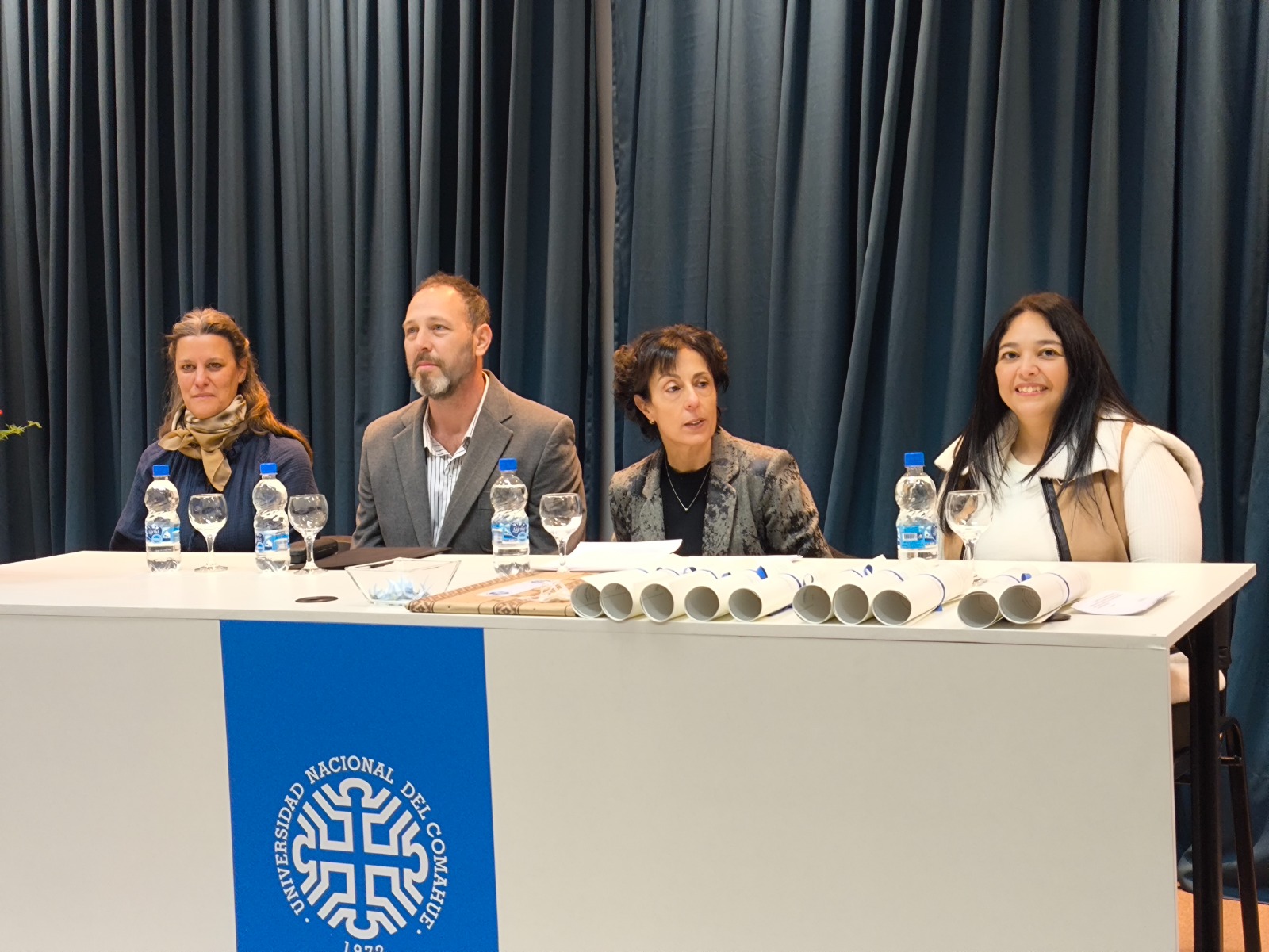 La jornada abrió con el acto de colación del módulo de Neuquén de la Facultad de Derecho y Ciencias Sociales con la entrega de 7 títulos de Servicio Social en el Aula Magna, con la presencia del decano Juan Carlos Fernández y la secretaria Académica Teresa Braicovich.