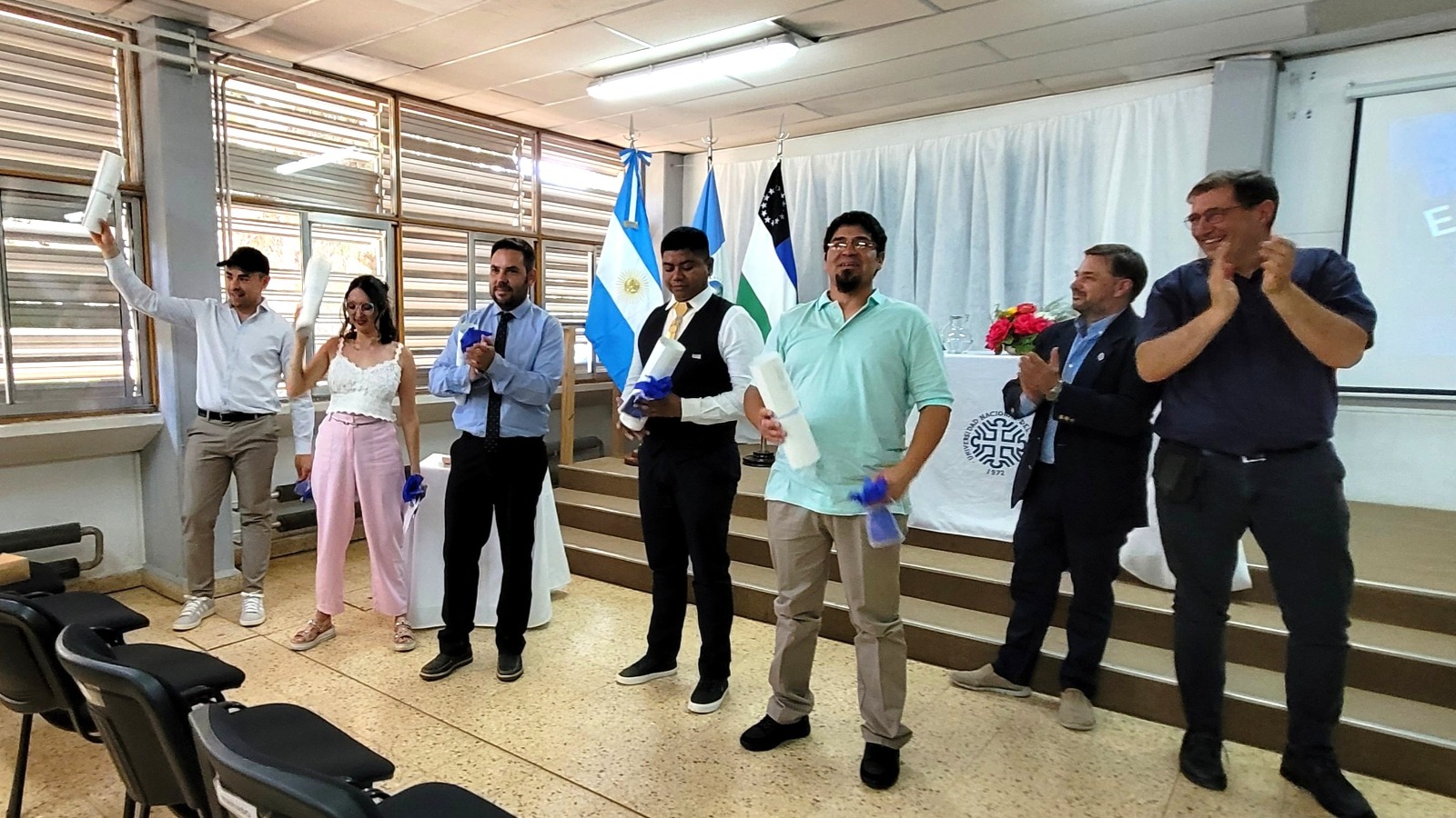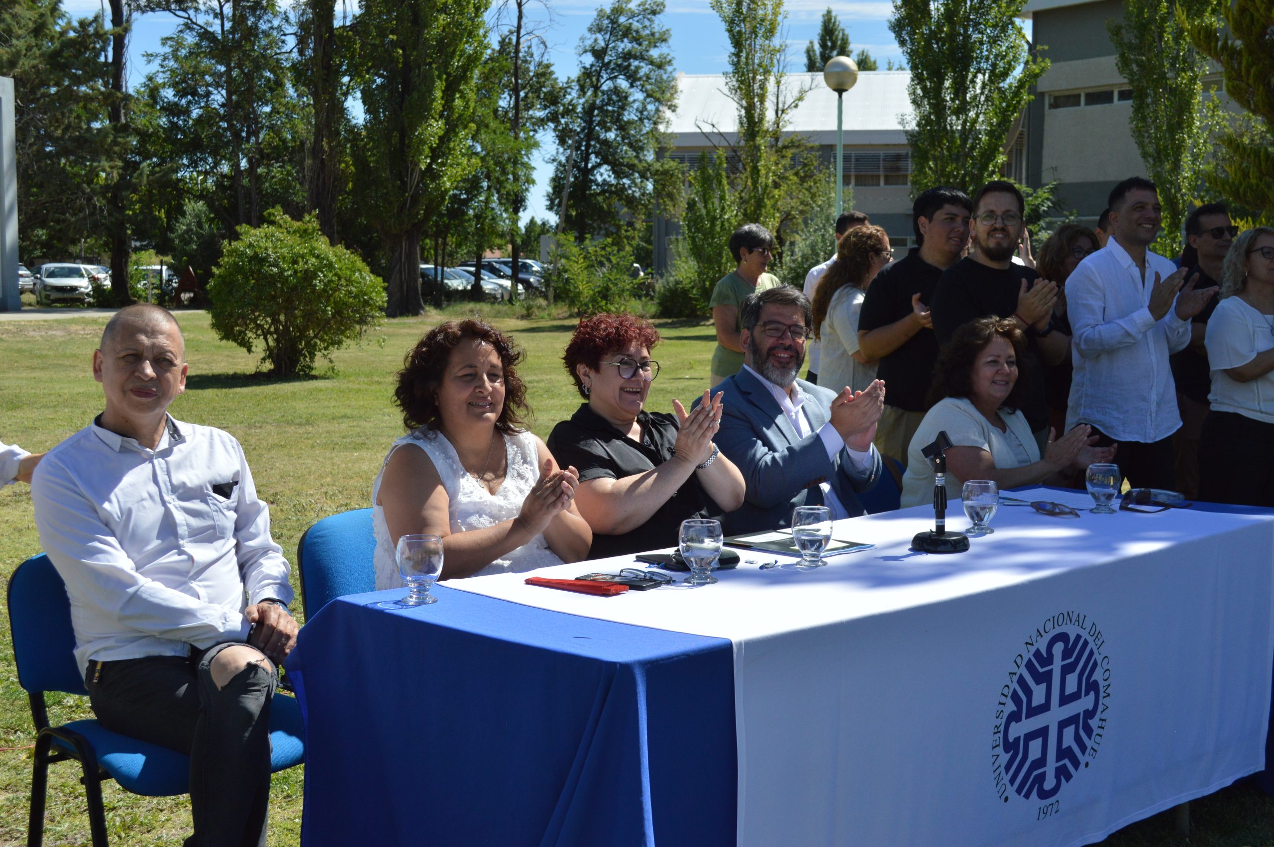 Al mediodía, en la Faculta de Ciencias Agrarias, ubicada en Cinco Saltos, Río Negro, se entregaron diplomas a cuatro egresados y egresadas de esa unidad académica. El acto lo presidió el decano Esteban Jockers acompañado por el secretario de Bienestar Universitario, Alejo Simonelli.