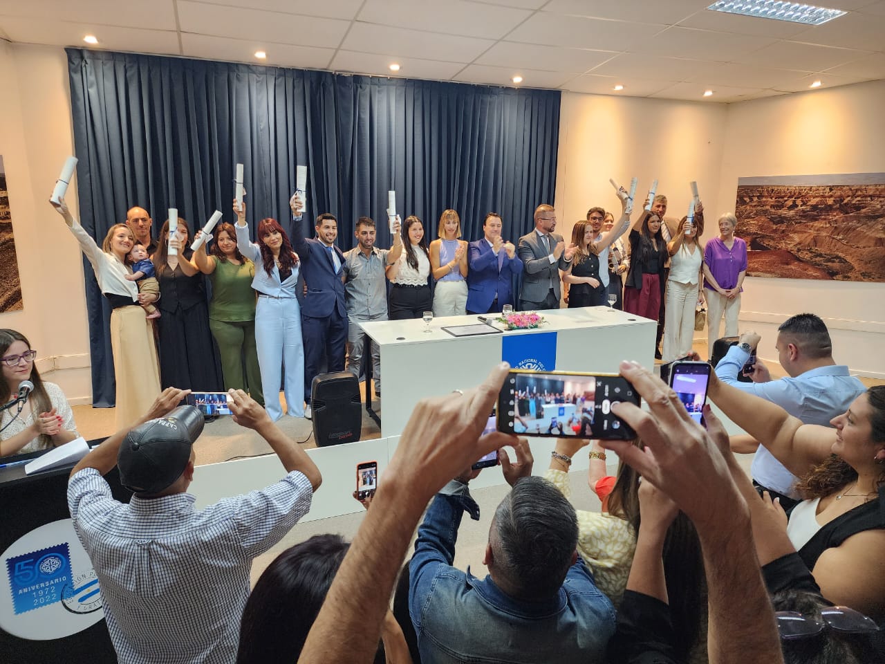 La jornada del viernes abrió a las 10 con la entrega de 22 diplomas a egresados y egresadas de diferentes carreras que se dictan en la Facultad de Derechos y Ciencias Sociales de General Roca.  La ceremonia la encabezó el decano Juan Carlos Fernández.