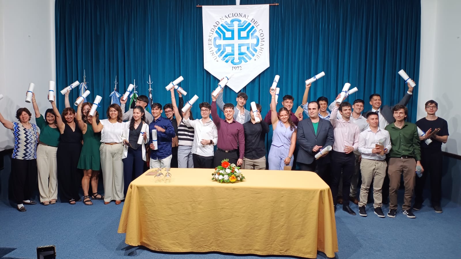 A partir de las 11, en el Aula Magna de la sede central de la UNCo, la Facultad de Ingeniería entregó 41 títulos a egresados y egresadas de sus carreras. El acto estuvo encabezado por el vicedecano Marcelo Moreyra y por el subsecretario de Relaciones Internacionales y director de Posgrado, Enrique Mases.