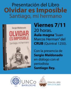 Este viernes 7 de noviembre a las 20 horas, el Centro Regional Universitario Bariloche de la Universidad Nacional del Comahue (UNCo) será escenario de una actividad profundamente significativa: la presentación del libro “Olvidar es imposible. Santiago, mi hermano”, escrito por Sergio Maldonado. El encuentro se realizará en el Aula Magna “Juan Marcos Herman” (Quintral 1250) y contará con la participación del autor, acompañado por el periodista Santiago Rey.