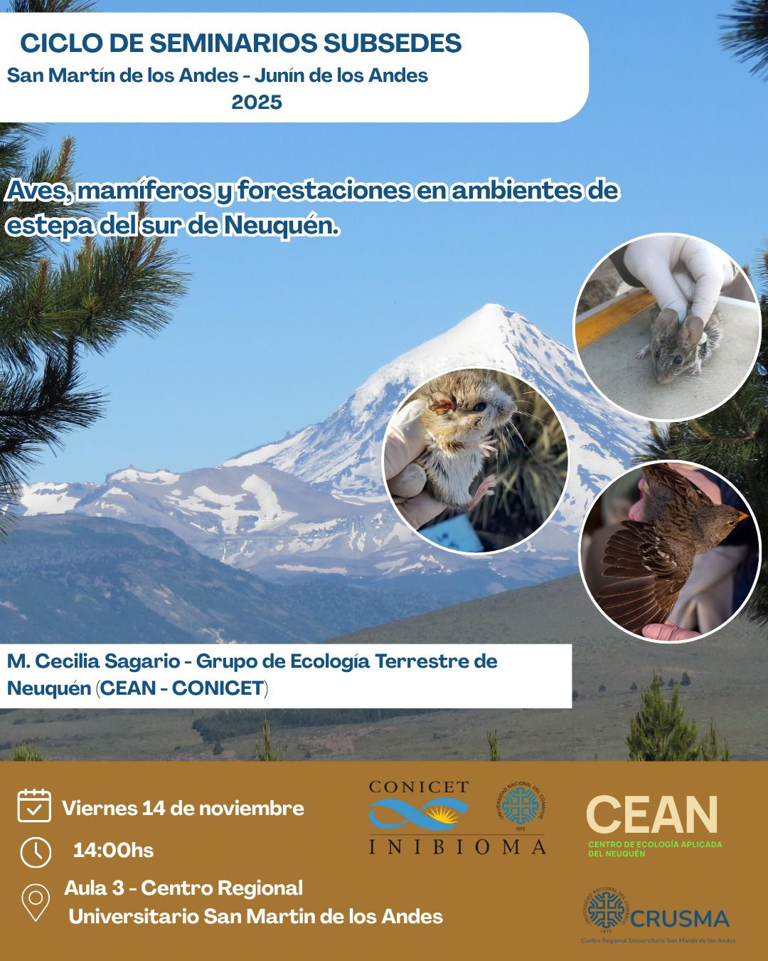 El Centro Regional Universitario San Martín de los Andes (CRUSMA), perteneciente a la Universidad Nacional del Comahue (UNCo), será sede este viernes 14 de noviembre de un seminario académico que propone pensar la biodiversidad y el impacto de las forestaciones en los ambientes de estepa del sur neuquino. La actividad, titulada “Aves, mamíferos y forestaciones en ambientes de estepa del sur de Neuquén”, se desarrollará a las 14 horas en el aula 3 del CRUSMA y estará a cargo de la investigadora Cecilia Sagario, integrante del Grupo de Ecología Terrestre de Neuquén (CEASN – CONICET).