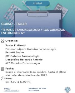 A partir del miércoles 8 de octubre, la Universidad Nacional del Comahue (UNCo) pondrá en marcha el curso–taller “Temas de Farmacología y los Cuidados Enfermeros IV”, una propuesta académica que se inscribe en el Programa de Educación Continua de la Licenciatura en Enfermería del Centro Universitario Regional Zona Atlántica Sur (CURZAS). La actividad se desarrollará todos los miércoles hasta fines de noviembre, de 14 a 17 horas, con modalidad gratuita y cupos limitados.
