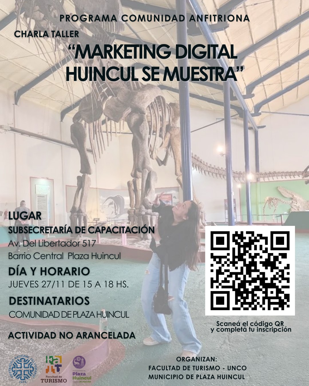 El próximo jueves 27 de noviembre, Plaza Huincul será sede de la última charla-taller académica del año, con una propuesta que combina formación, innovación y compromiso territorial. Bajo el título “Marketing digital: Huincul se muestra”, la actividad se desarrollará de 15:00 a 18:00 horas en la Subsecretaría de Capacitación (Av. del Libertador 517, Barrio Central), y estará a cargo de la Mg. Andrea del Pilar Vauthay, referente del programa Descubrí tu destino. Organizada en articulación con la Universidad Nacional del Comahue (UNCo), esta iniciativa se inscribe en una línea de trabajo que busca fortalecer el vínculo entre conocimiento académico y desarrollo turístico regional, apostando a que cada participante se convierta en un comunicador activo de su territorio.