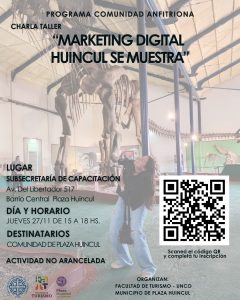 El próximo jueves 27 de noviembre, Plaza Huincul será sede de la última charla-taller académica del año, con una propuesta que combina formación, innovación y compromiso territorial. Bajo el título “Marketing digital: Huincul se muestra”, la actividad se desarrollará de 15:00 a 18:00 horas en la Subsecretaría de Capacitación (Av. del Libertador 517, Barrio Central), y estará a cargo de la Mg. Andrea del Pilar Vauthay, referente del programa Descubrí tu destino. Organizada en articulación con la Universidad Nacional del Comahue (UNCo), esta iniciativa se inscribe en una línea de trabajo que busca fortalecer el vínculo entre conocimiento académico y desarrollo turístico regional, apostando a que cada participante se convierta en un comunicador activo de su territorio.