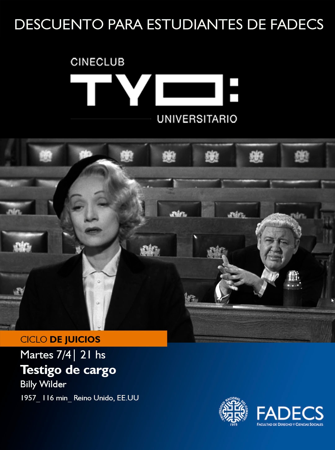 El Cineclub TYÖ Universitario presenta una nueva propuesta cultural que une cine y reflexión académica. En el marco del ciclo “Las películas de juicios”, la próxima función será el martes 7 de abril a las 21 horas en la Casa de la Cultura, con la proyección de Testigo de cargo (Witness for the Prosecution, 1957, Reino Unido), dirigida por Billy Wilder.
