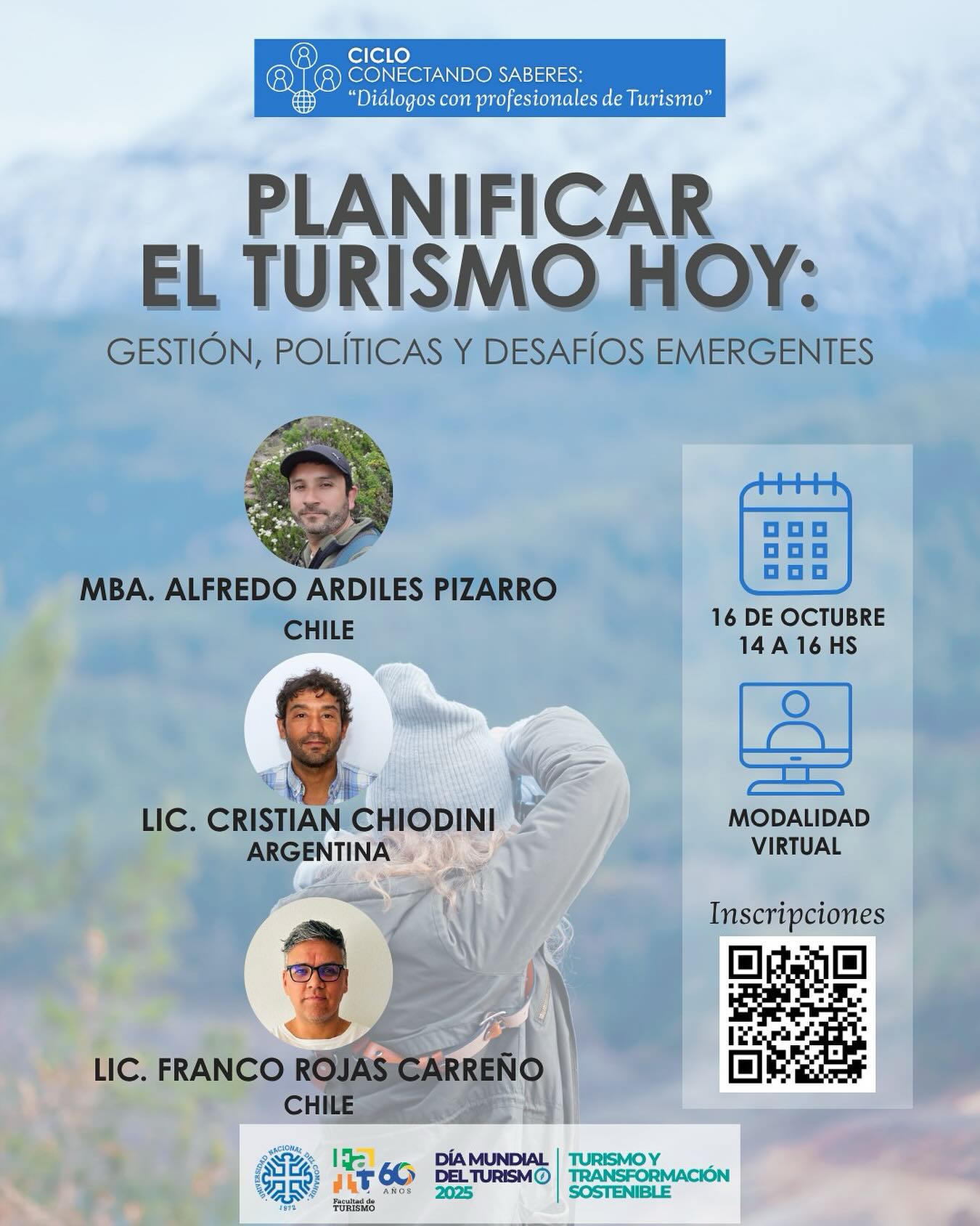 El panel, titulado “Planificar el turismo hoy: gestión, políticas y desafíos emergentes”, se desarrollará el jueves 16 de octubre, de 14:00 a 16:00 hs (Argentina), en modalidad virtual y con acceso gratuito. La actividad busca generar un espacio de reflexión colectiva sobre los nuevos escenarios del turismo contemporáneo, convocando a especialistas de Chile y Argentina que aportarán miradas diversas desde la gestión pública, la innovación empresarial y el desarrollo sostenible.