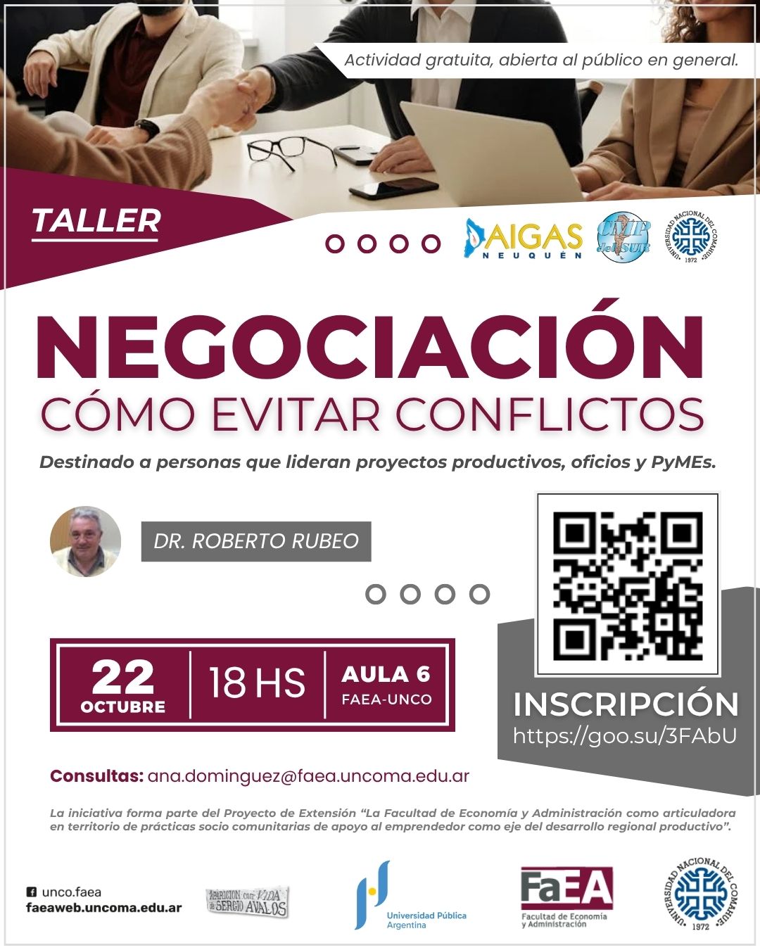 La Facultad de Economía y Administración de la Universidad Nacional del Comahue (UNCo) invita a participar de la charla presencial “Negociación: cómo evitar los conflictos”, una propuesta académica y comunitaria que busca fortalecer habilidades de comunicación, resolución pacífica de diferencias y construcción de acuerdos en contextos diversos. La actividad se desarrollará el miércoles 22 de octubre a las 18 h en el Aula 6 de la sede ubicada en Buenos Aires 1400, Neuquén capital, y estará a cargo del Dr. Roberto Rubeo, especialista en procesos de negociación y gestión de conflictos.