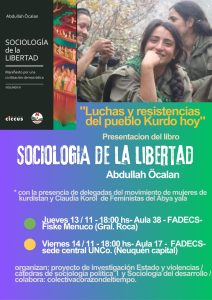 La Facultad de Derecho y Ciencias Sociales de la Universidad Nacional del Comahue (UNCo) será sede de una doble jornada de reflexión crítica y diálogo internacional con la presentación del libro Sociología de la libertad, del pensador kurdo Abdullah Öcalan. La actividad, organizada por el proyecto de investigación “Estado y violencias” junto a las cátedras de Sociología Política I y Sociología del Desarrollo, se realiza en articulación con la Colectiva Corazón del Tiempo y contará con la participación de delegadas del movimiento de mujeres de Kurdistán y de la reconocida activista Claudia Korol, integrante de Feministas del Abya Yala.