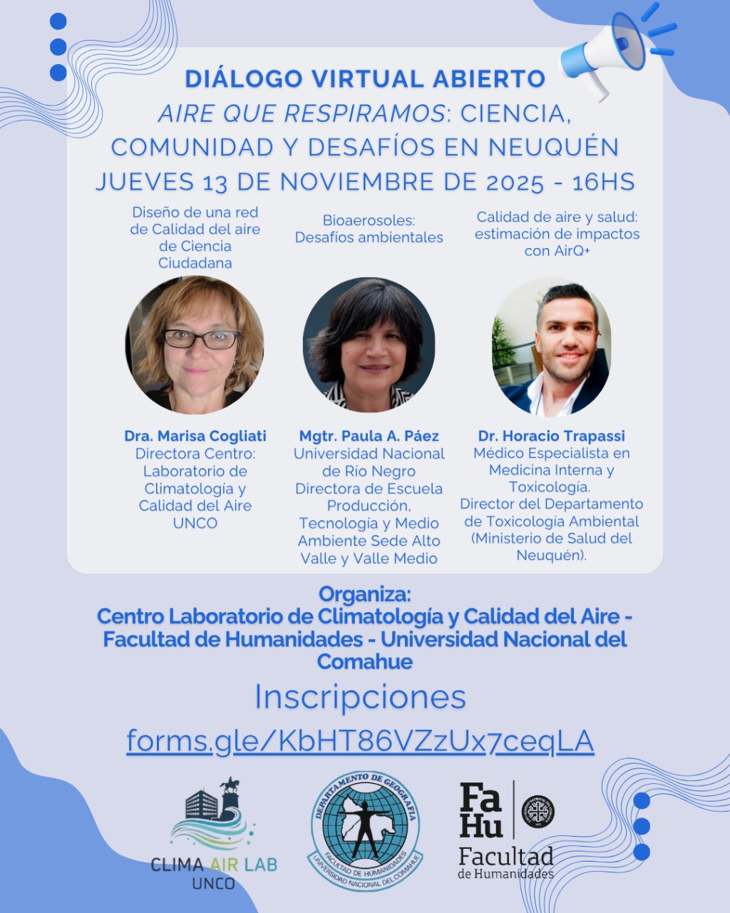 El próximo jueves 13 de noviembre a las 16:00 horas se llevará a cabo el diálogo virtual abierto “Aire que Respiramos: Ciencia, Comunidad y Desafíos en Neuquén”, una propuesta académica que busca reflexionar colectivamente sobre la calidad del aire en la región, sus implicancias sanitarias y ambientales, y los desafíos que enfrentan las comunidades en el contexto actual. La actividad es organizada por el Laboratorio de Climatología y Calidad del Aire de la Facultad de Humanidades de la Universidad Nacional del Comahue (UNCo), y se enmarca en una política institucional que promueve el vínculo entre ciencia, territorio y ciudadanía.