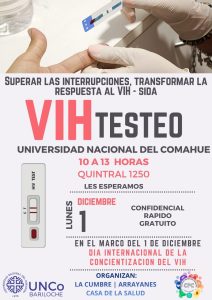 El lunes 1° de diciembre, en el marco del Día Mundial de la Lucha contra el VIH/SIDA, el Centro Regional Universitario Bariloche de la Universidad Nacional del Comahue (UNCo) será escenario de una jornada de testeo rápido de VIH y sífilis, abierta a toda la comunidad. La actividad se desarrollará de 10 a 13 horas en el hall central del edificio ubicado en Quintral 1250, y contará con la participación de los Centros de Atención Primaria de la Salud (CAPS) La Cumbre, Arrayanes y Casa de la Salud, junto al equipo del Centro de Prevención Combinada del Hospital Zonal Bariloche.