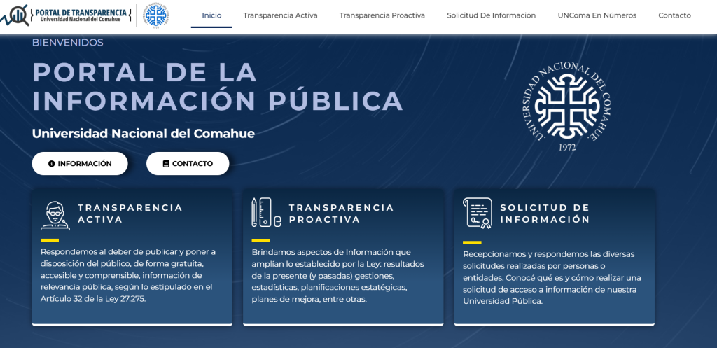 En cuanto al portal de transparencia, al que se puede acceder desde este enlace, se encuadra en lo normado por la ley 27275 de Argentina garantiza el derecho de acceso a la información pública,