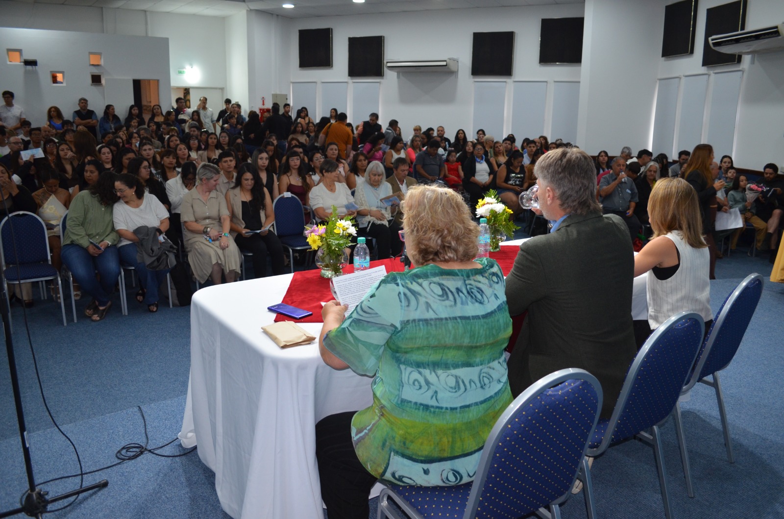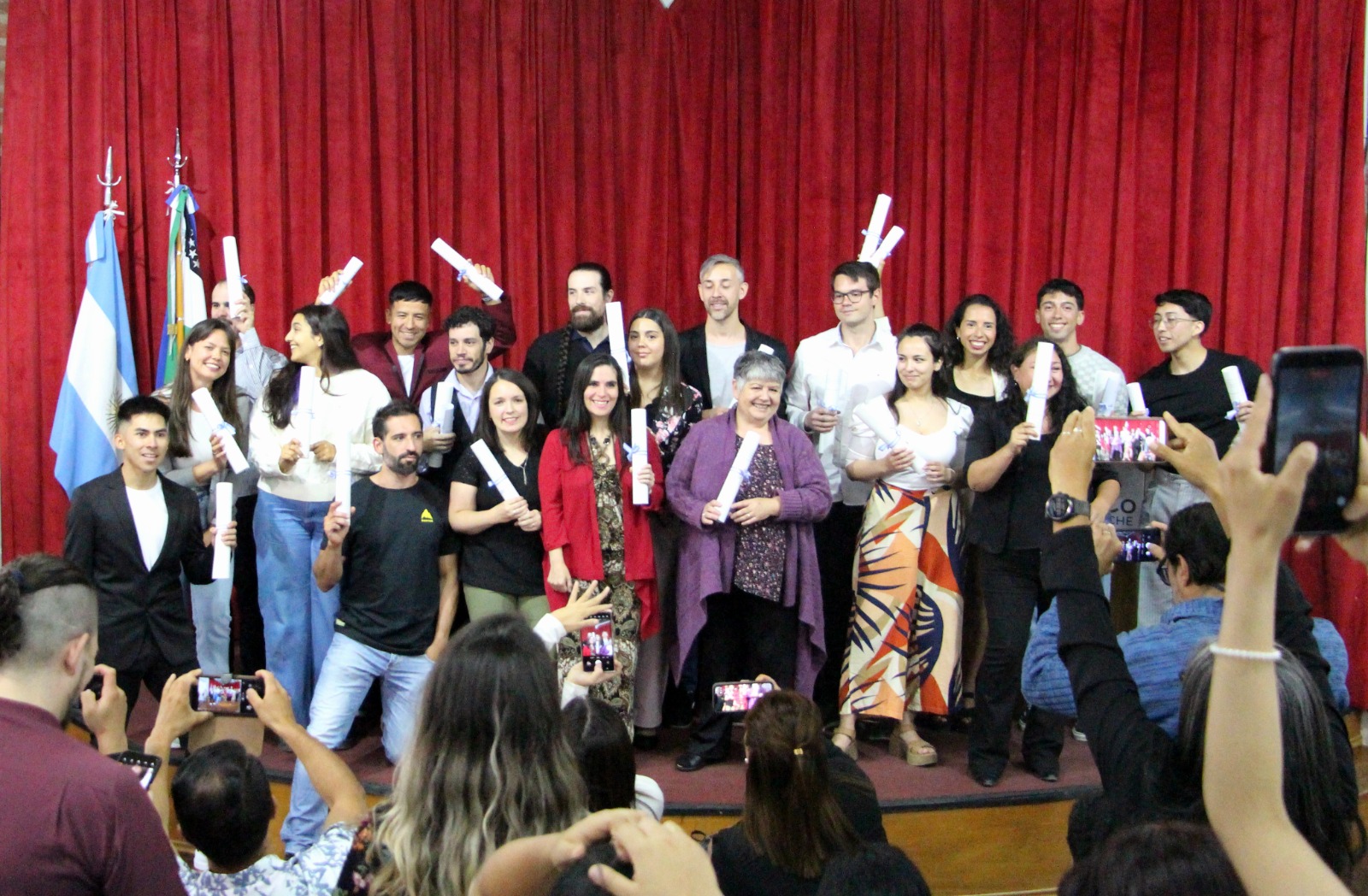 Una hora después comenzó el mencionado acto de entrega de diplomas en el CRUB, de donde egresaron 24 estudiantes. La ceremonia se llevó a cabo en el Aula Mayor y recibieron sus diplomas graduados y graduadas de las carreras de pregrado, grado y posgrado.