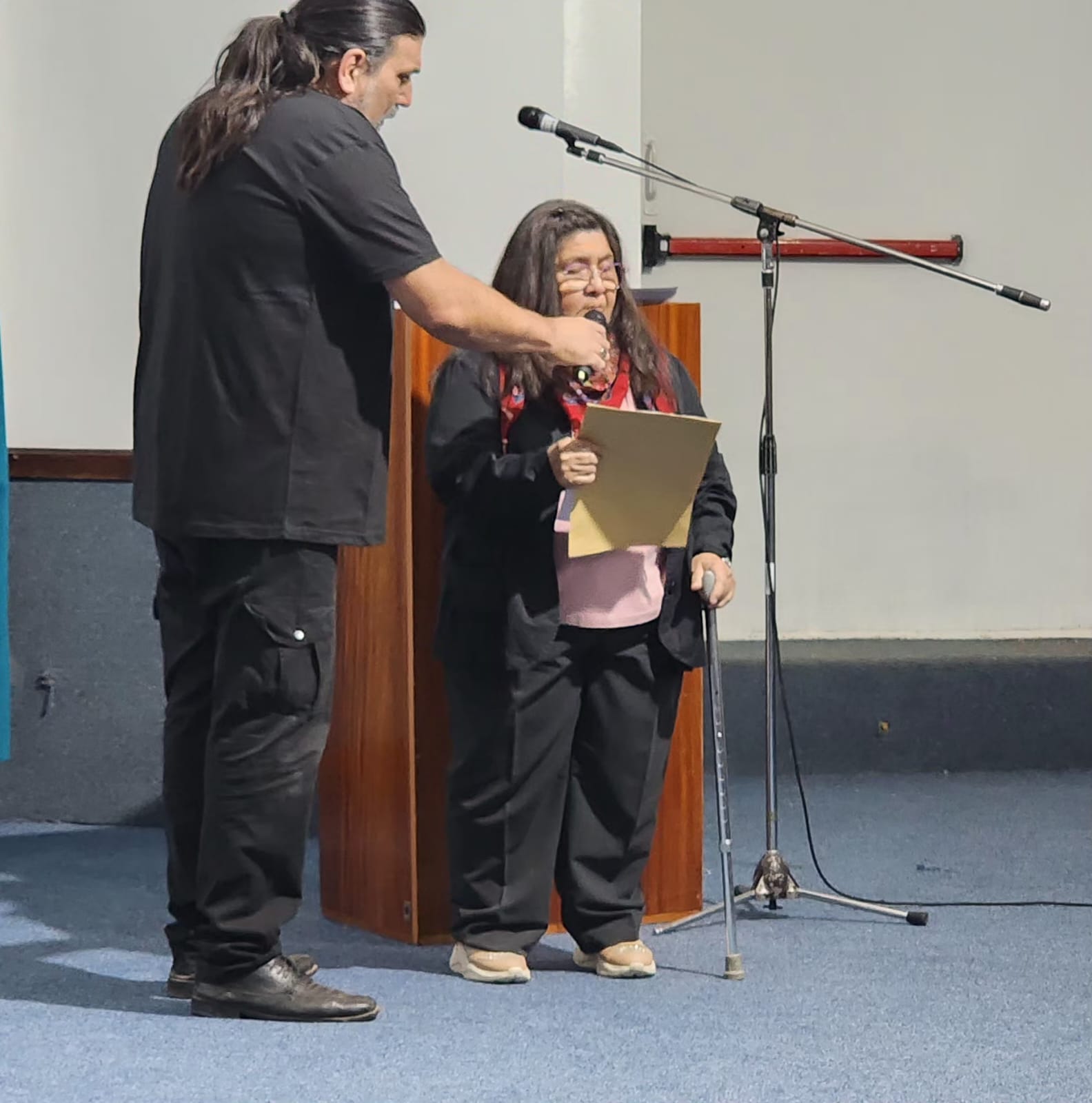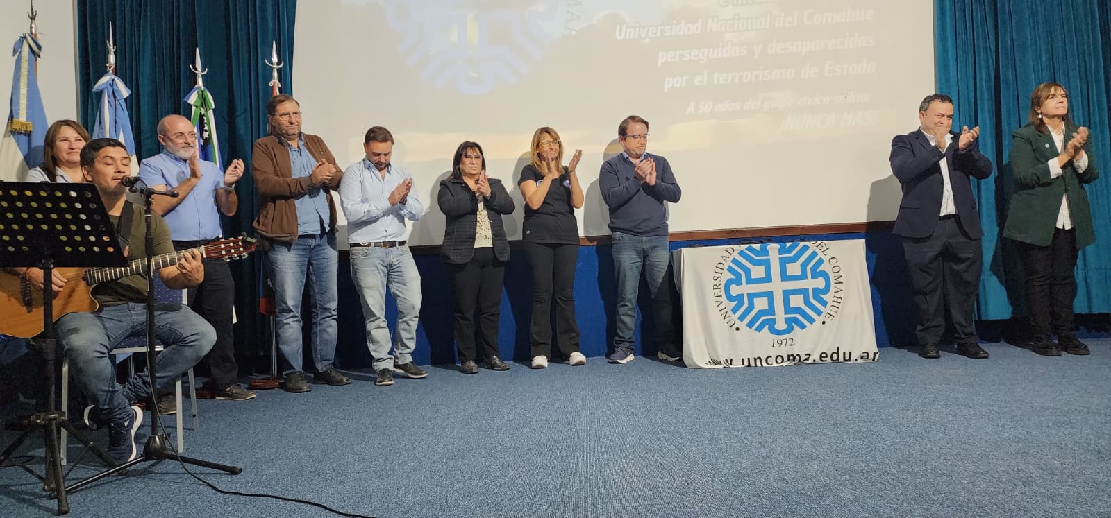 Santiago Palacios y su guitarra dieron inicio a la ceremonia con la entonación del Himno Nacional. Luego hablaron, en representación de las mujeres homenajeadas, Gladis Sepúlveda y Silvia Barco. Lo hicieron con reseñas sobre sus respectivas militancias y las luchas por la nacionalización de la UNCo, en tiempos de otras dictaduras, y la resistencia posterior a las intervenciones.