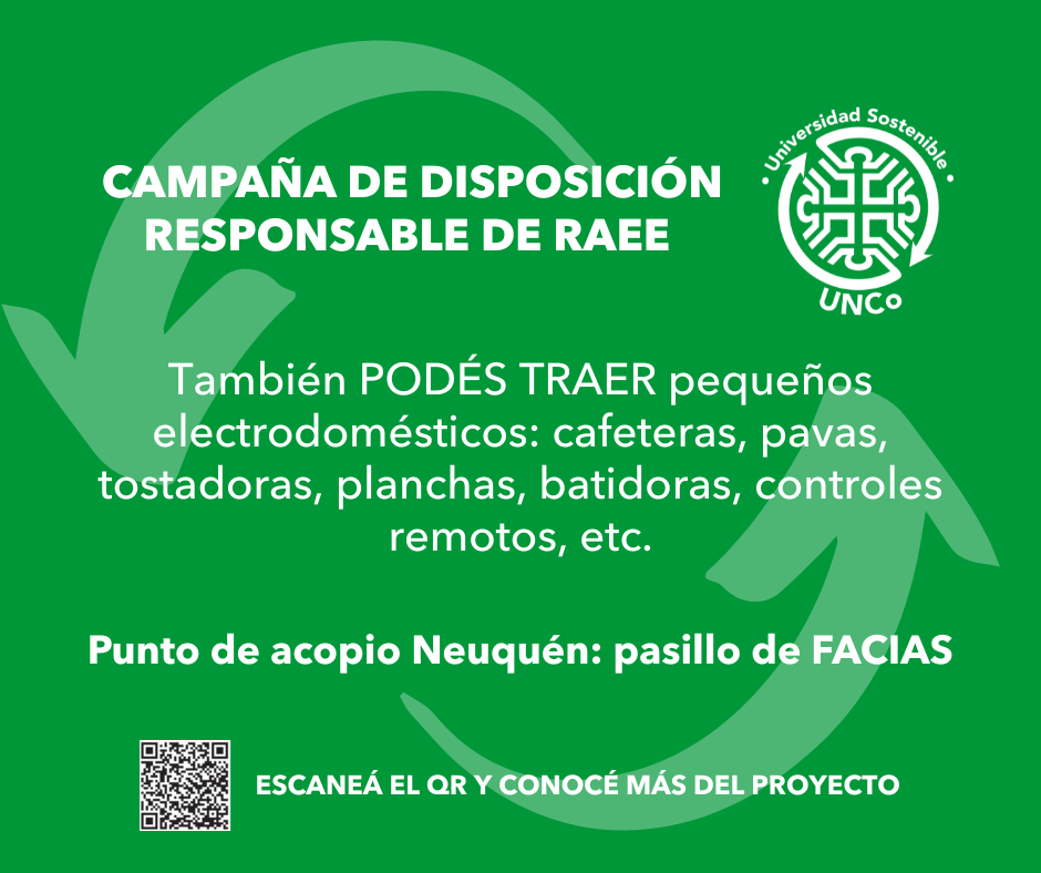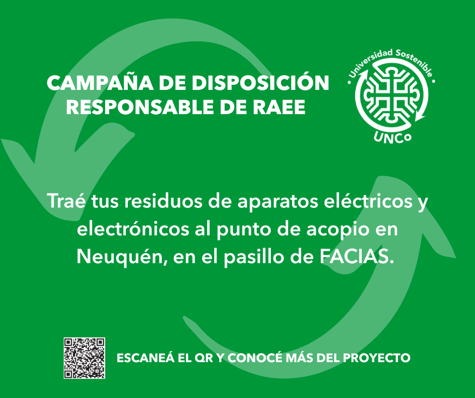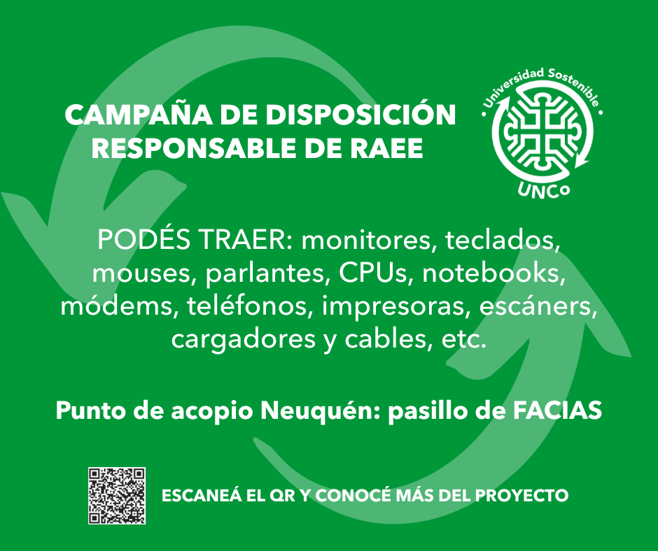 El primer punto de acopio de los RAEE está ubicado en el pasillo de la Facultad de Ciencias del Ambiente y la Salud, en la sede central de la UNCo. Este punto permanente permitirá hacer un descarte responsable de artefactos tecnológicos que han cumplido su ciclo de vida.