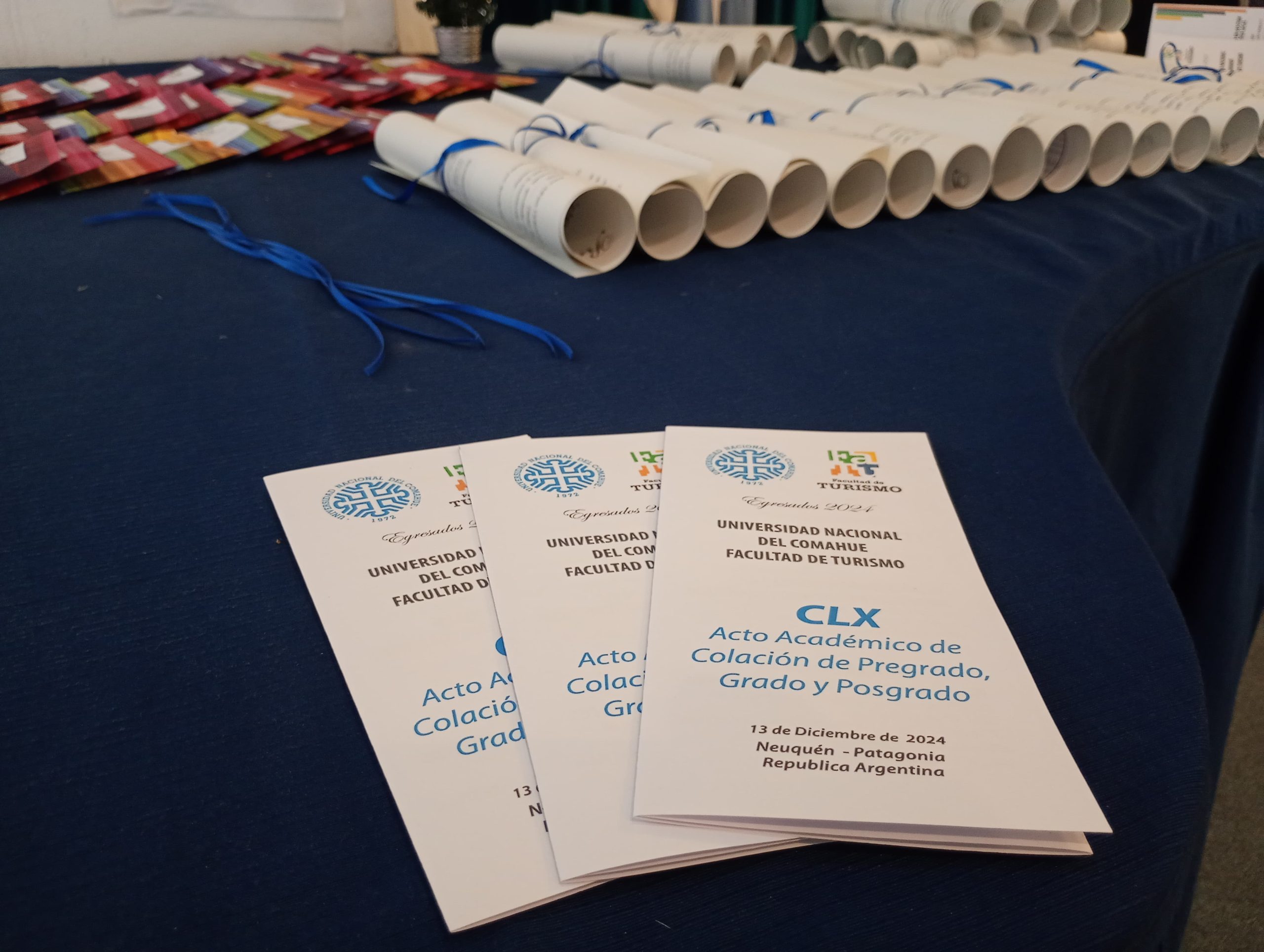 Durante la tarde hubo dos actos más. A las 16 la Facultad de Turismo entregó 32 diplomas a sus egresados y egresadas en una ceremonia que tuvo lugar en el Aula Magna, encabezada por el decano Carlos Espinosa y el secretario de Extensión Universitaria Damián Cancelo.