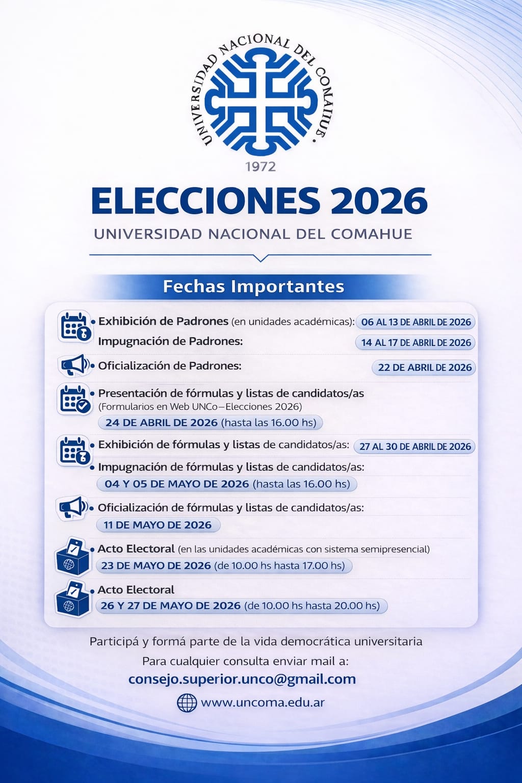 En estos comicios se elegirá por primera vez decanos o decanas en tres unidades académicas: Facultad de Ciencias Marinas, Centro Universitario Regional Zapala y Centro Regional Universitario San Martín de los Andes, creadas en la última reforma estatutaria aprobada por la Asamblea Universitaria del 2024.