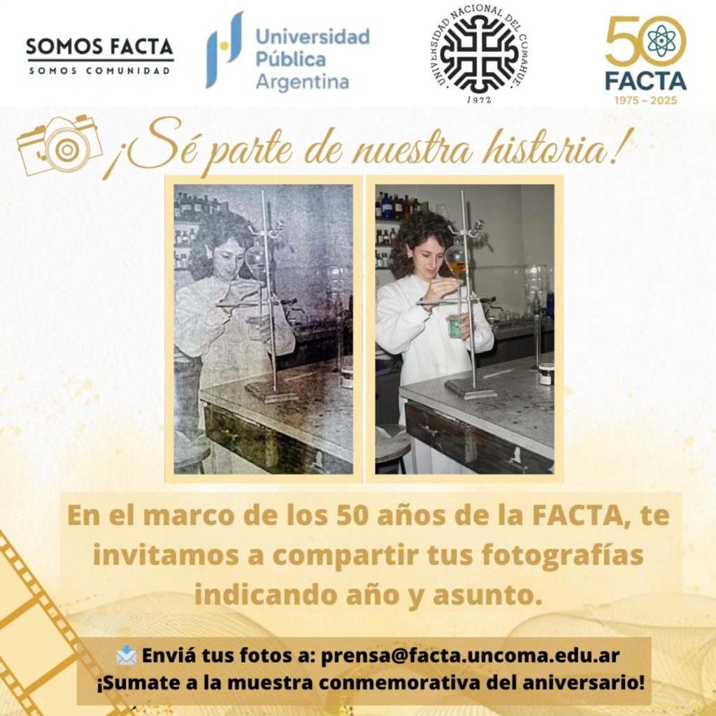 La Facultad de Ciencias y Tecnología de los Alimentos (FACTA) de la Universidad Nacional del Comahue cumple medio siglo de vida institucional, y lo celebra con una propuesta que invita a mirar hacia atrás para proyectar el futuro: una convocatoria abierta a toda su comunidad para reunir fotografías que cuenten la historia compartida desde 1975.