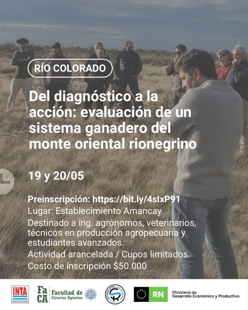 La capacitación se desarrollará los días 19 y 20 de mayo en Río Colorado, con modalidad presencial. El primer día, de 9:30 a 20:00 horas, se trabajará en el establecimiento Amancay, realizando actividades de campo, seguimiento de condiciones de pastoreo y relevamiento de hacienda. El segundo día, de 8:00 a 16:00 horas, la jornada continuará en la Sociedad Rural de Río Colorado, con la elaboración de diagnósticos y el diseño de alternativas de mejora para el sistema productivo.