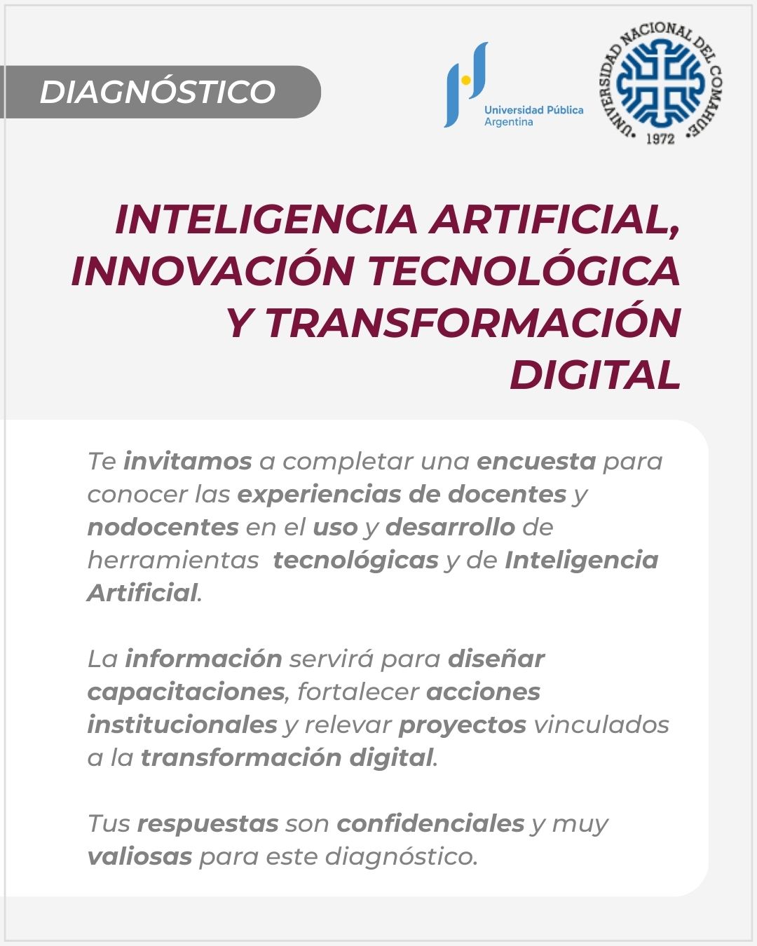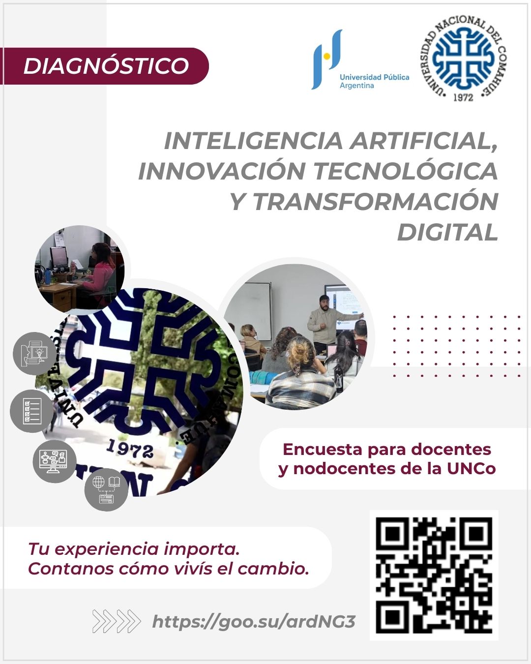 Con el objetivo de conocer y relevar las actividades que realizan los/as docentes y nodocentes de la Administración Central y de las Unidades Académicas, así como identificar los proyectos en los que se utilicen o desarrollen herramientas de Inteligencia Artificial (IA), te invitamos a completar esta breve encuesta.