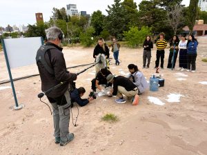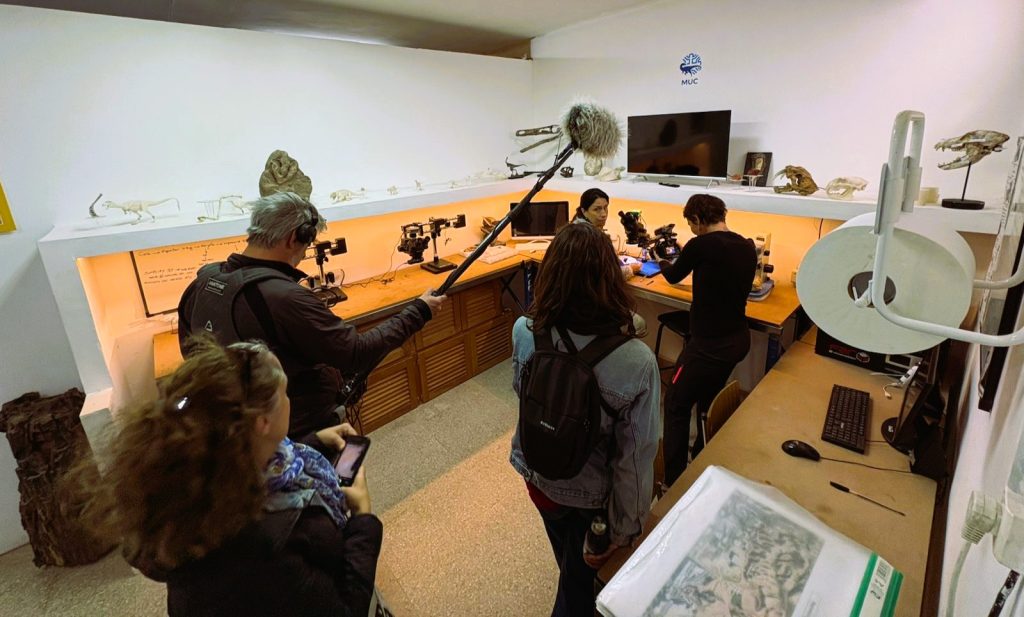 El rodaje comenzó en el campus universitario de la UNCo, en un sitio de nidificación de aves cretácicas, y continuará en afloramientos de la cuenca neuquina. Allí, los paleontólogos Juan Porfiri y Domenica Dos Santos, junto a estudiantes de la carrera de Geología, guían al equipo documental en una exploración que combina ciencia de campo, formación académica y divulgación.