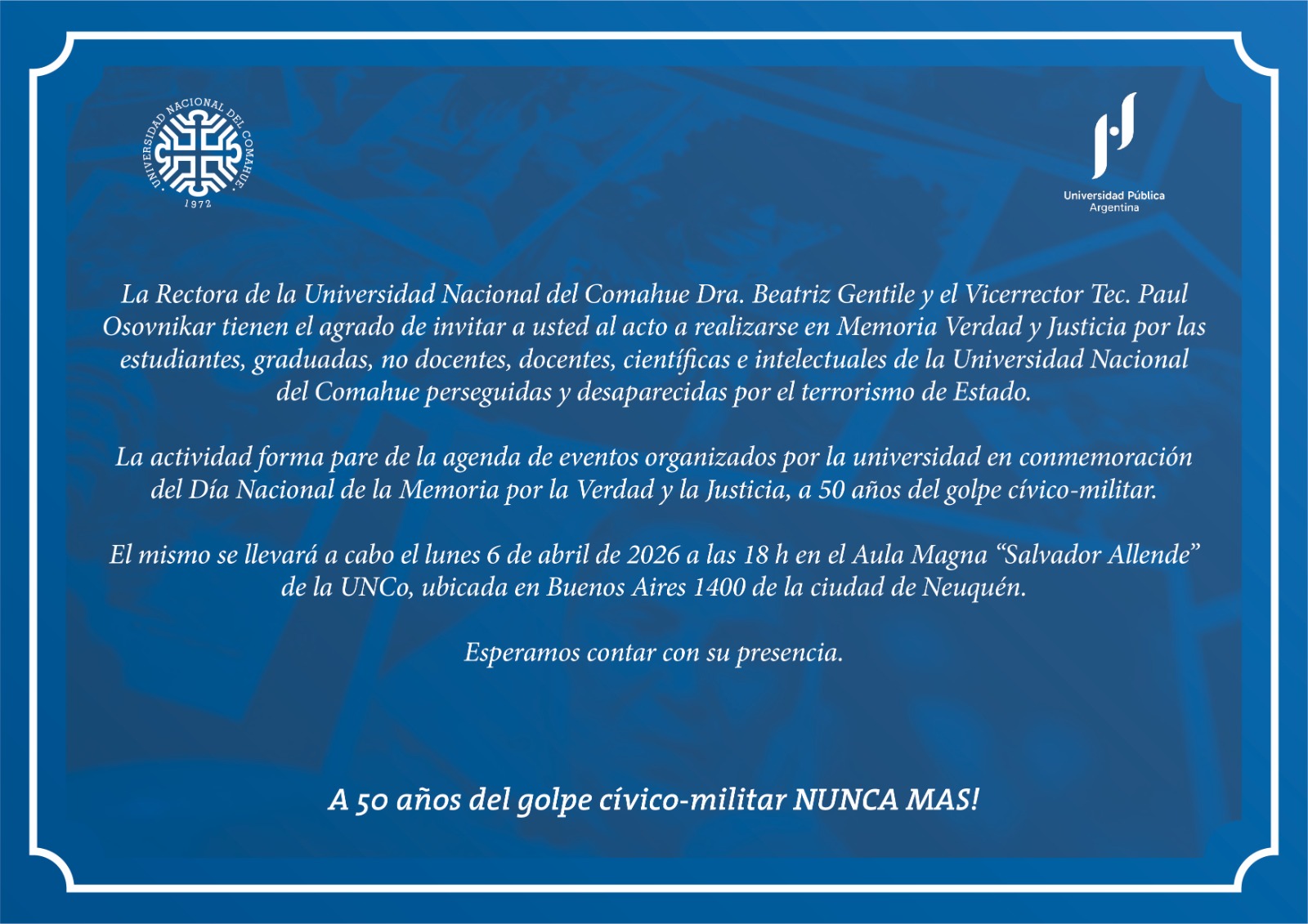 En el contexto de diferentes actividades organizadas por la Universidad Nacional del Comahue con motivo de los 50 años del último golpe cívico militar, el próximo lunes 6 de abril a las 18 se realizará un reconocimiento a mujeres de esta casa de estudio que fueron víctimas de la dictadura que gobernó la Argentina a partir del 24 de marzo de 1976.