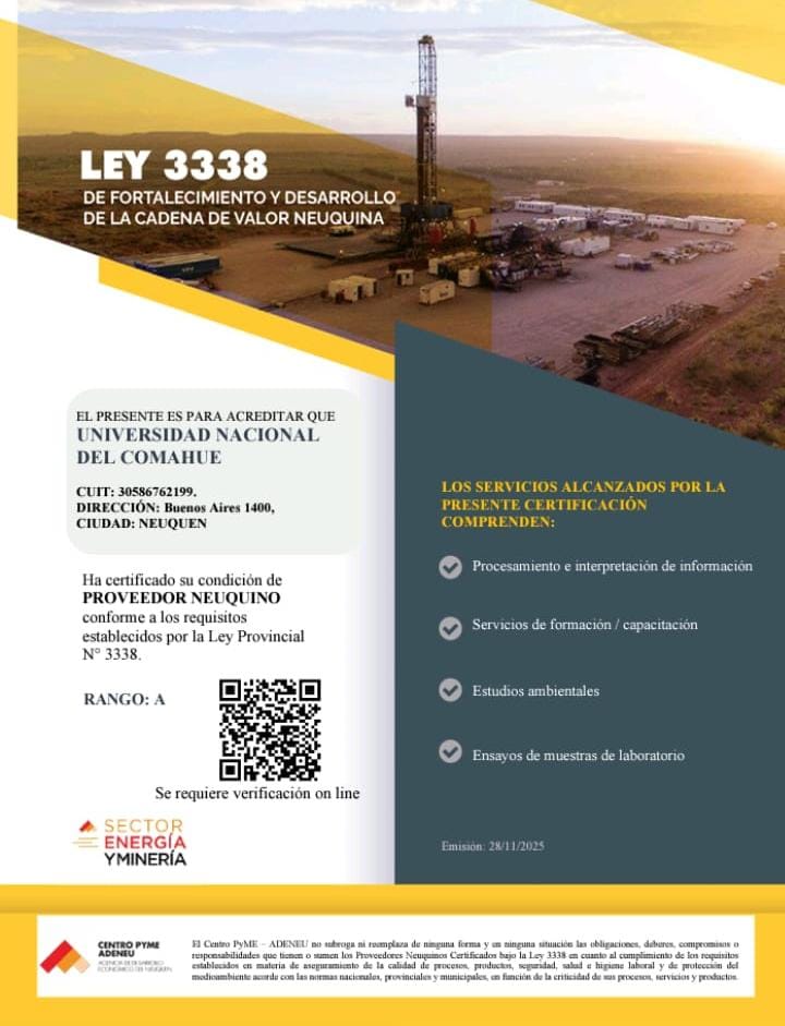 La Universidad Nacional del Comahue ha logrado certificar como proveedora neuquina, conforme a los requisitos establecidos por la Ley Provincial N° 3338 de fortalecimiento y desarrollo de la cadena de valor.