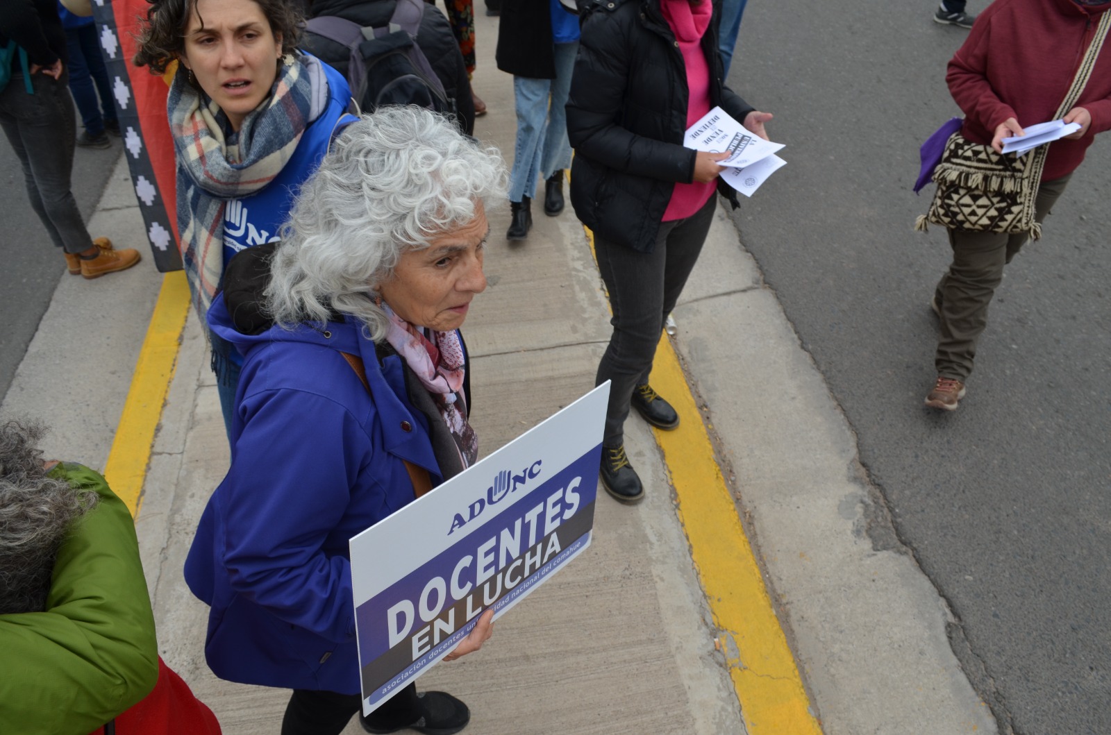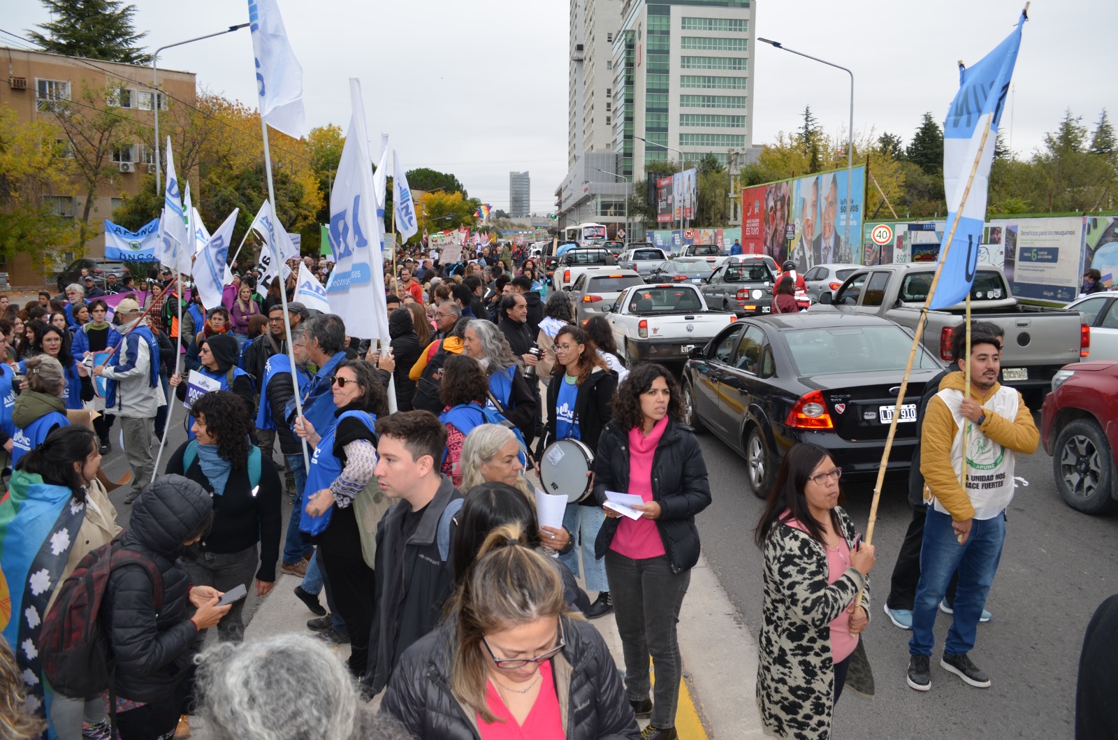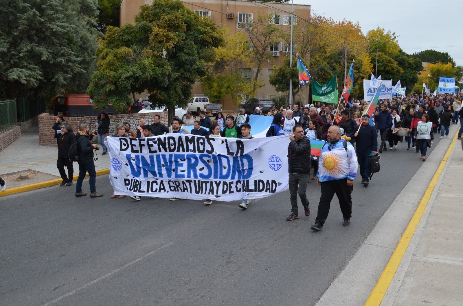 «La universidad pública está de pie», dijo la rectora de la Universidad Nacional del Comahue (UNCo), Beatriz Gentile, en el multitudinario banderazo que se realizó este mediodía en la sede central de la Universidad